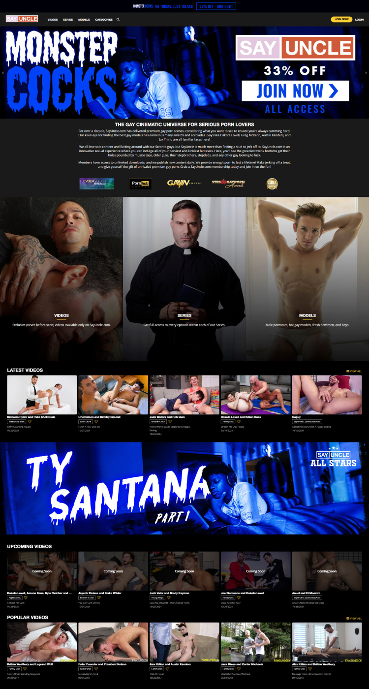 Say Uncle is a network of 26 exclusive gay porn series. From taboo religious & fauxcest themes to doctor/patient sex, school bullies, Latin, Black & interracial, group action & car sex. 3,501 videos to download, stream & watch on your mobiles with updates added every single day, plus 35 bonus video collections. Lots of oral & anal sex.